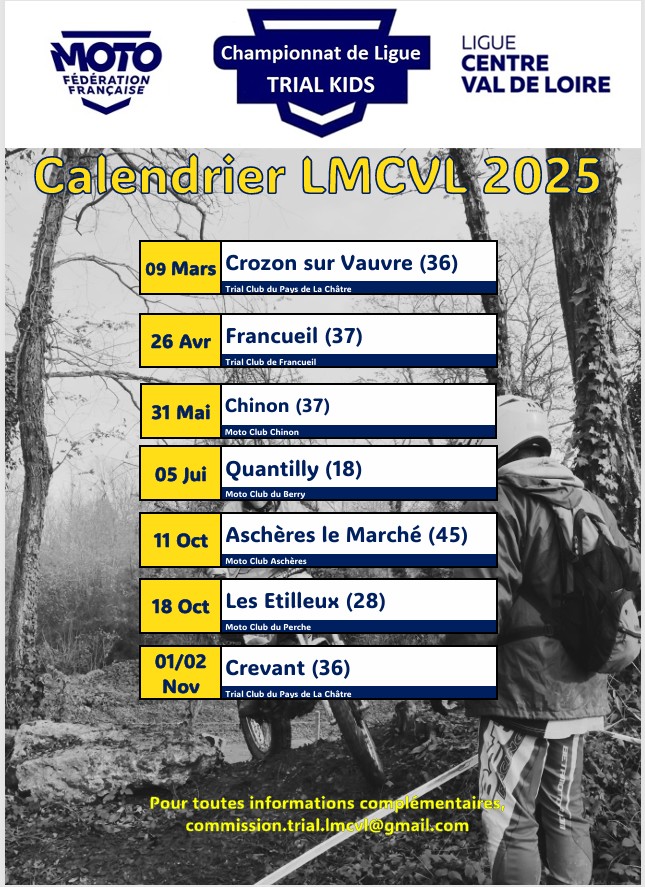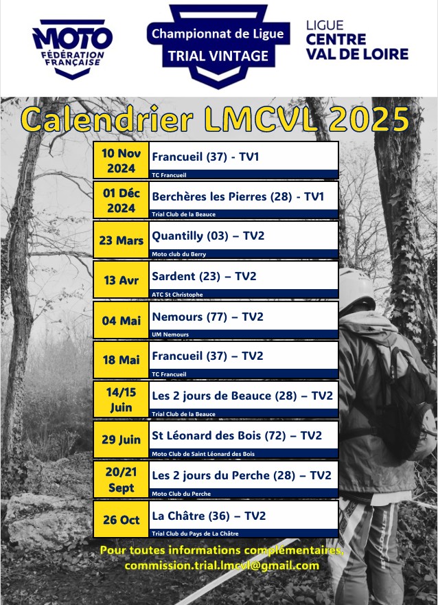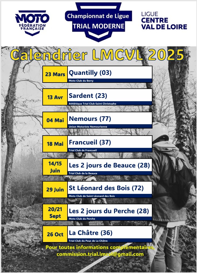 Dates de compétitions 2025 (tableau en lien) calendrier provisoire 2025Télécharger Vous devriez également aimer Travaux sur le Terrain de Francueil en préparation du trial des Régions 2025 11/02/2024 Rando 8 septembre 2018 08/09/2018 AFATA 9 septembre 2018 09/09/2018